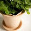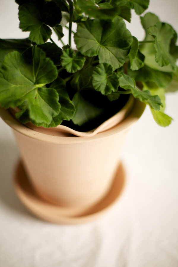 Planteringskruka i terrakotta med fat i stengods. Krukan är oglaserad. Fatet är glaserat i vitt på insidan. Krukans färg kan variera i olika toner. Med tiden bildar vattnets salter en vit dekor på krukan.